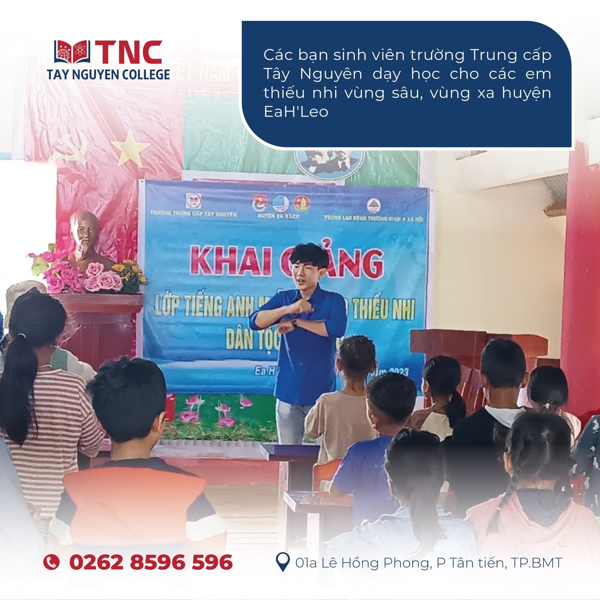 Trong mùa hè 2023 vừa qua, được sự cho phép và phối hợp tổ chức từ UBND huyện Ea H’leo, Đoàn huyện Ea H’leo, các bạn sinh viên trường Trung cấp Tây nguyên đã tham gia chiến dịch Mùa Hè Xanh, cụ thể, tổ chức 02 Lớp tiếng anh miễn phí cho các em thiếu nhi dân tộc thiểu số.